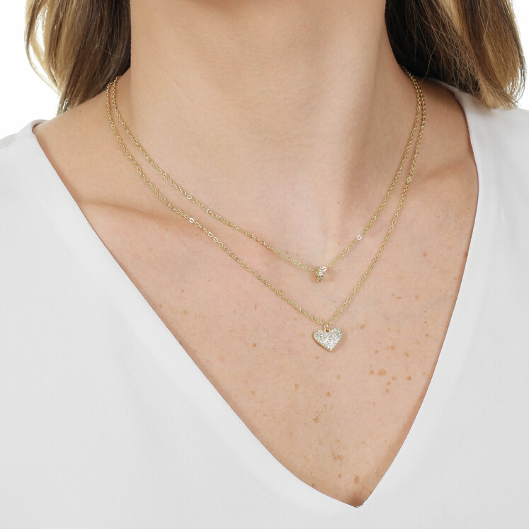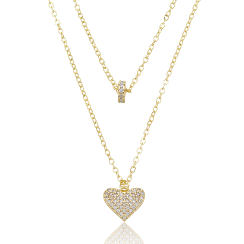 GARGANTILHA DUPLA COM CORAÇÃO E DISCO COM ZIRCÔNIAS